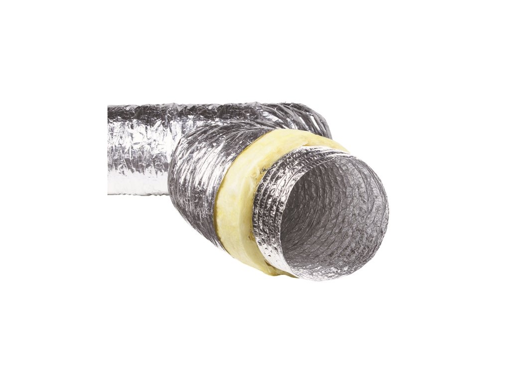 Velmi odolná ohebná Al laminátová hadice s vnitřním uspořádáním jako Aluflex MO, s tepelnou izolací z vrstvy ekologické nedráždivé minerální vaty tloušťky 25 mm, 16 kg/m3, parozábrana – zpevněný Al laminát.