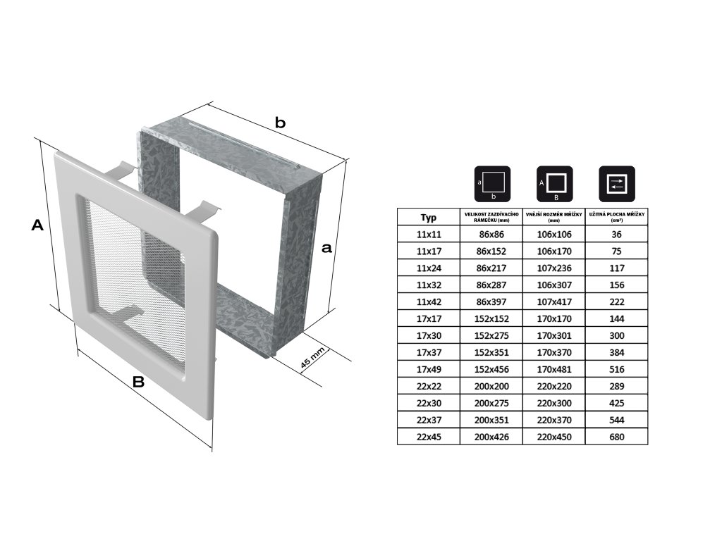 Údržba: Po odejmutí mřížky ze zazdívacího rámečku lze ošetřit jakýmkoliv běžným úklidovým prostředkem (nepoužívejte žíraviny, ředidla a rozpouštědla).