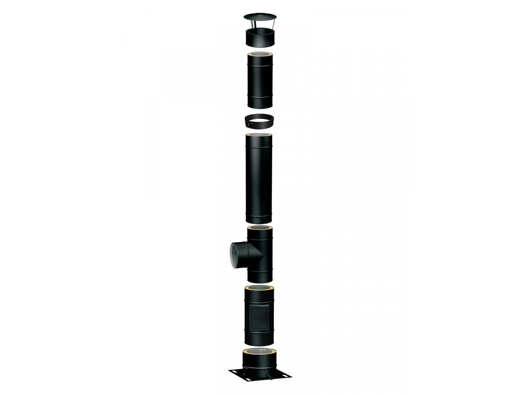 Výška sestavy se vypočítá následovně: pro příklad výběr varianty 5m = obdržíte 4m trubek + 1m v ostatních dílech (t-kus, základová deska, čistící díl)